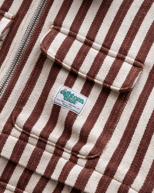 18 EAST ABAIR CHORE JACKET IN ECRU / SIERRA RUSSET AWNING STRIPED HERRINGBONE DENIM