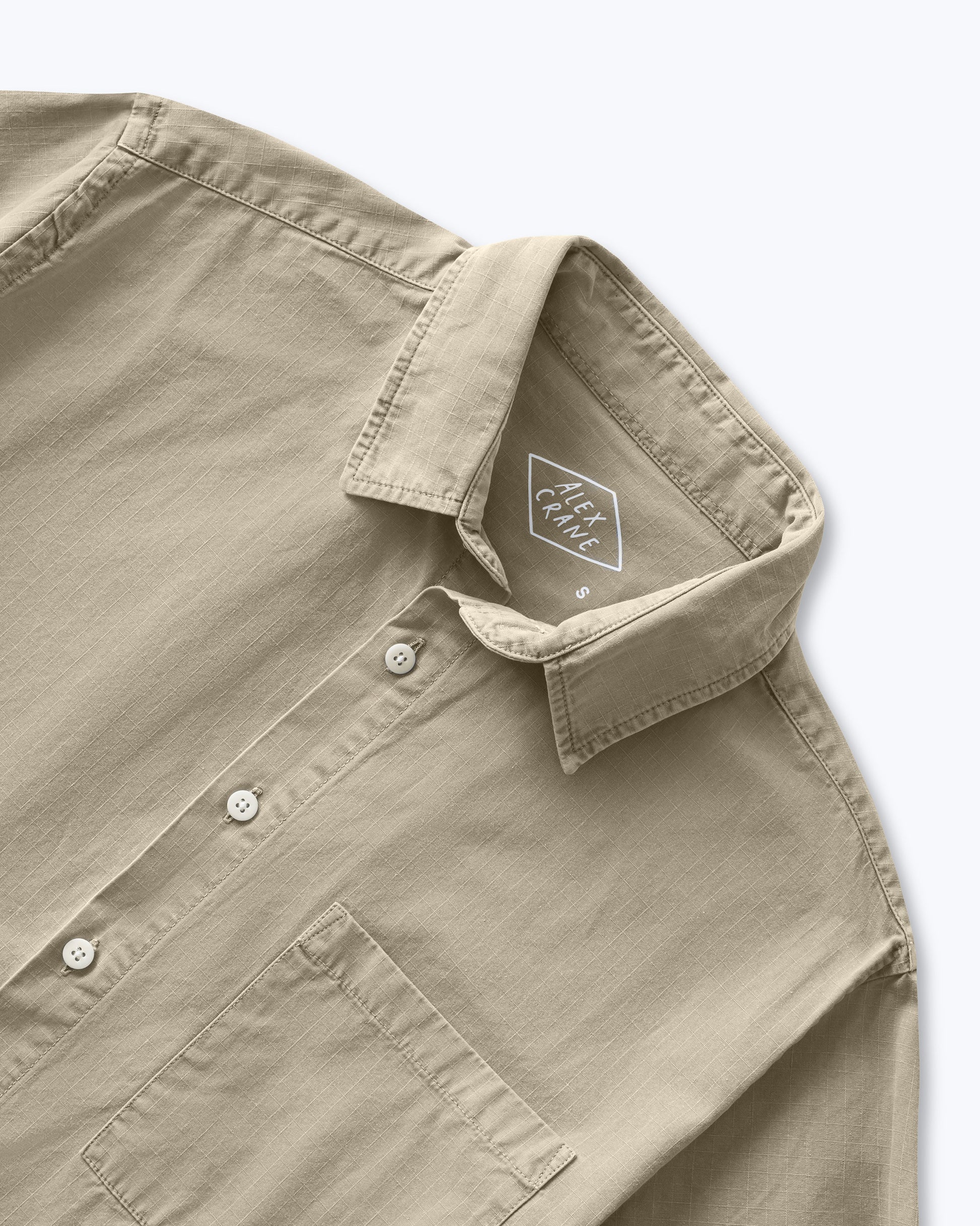 An earth-tone lightweight button-up collared shirt made with 100% organic cotton ripstop, garment dyed with natural dyes and washed in biodegradable softeners.